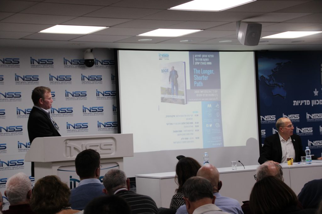 Following opening remarks by Ilan Greenfield of Gefen Publishing, which published the book, Dr. Michal Yaari interviewed Lt. Gen. (ret.) Ya’alon, who then answered questions from the audience. This was followed by a lecture by Amotz Asael, fellow at the Shalom Hartman Institute. INSS Deputy Director for Research and Analysis Brig. Gen. (ret.) Itai Brun delivered concluding remarks.
