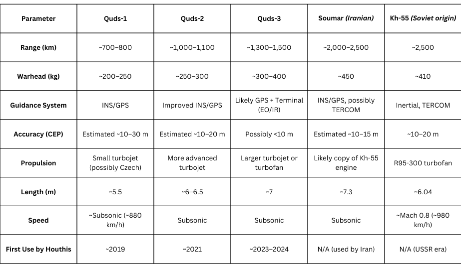 בשנים האחרונות האיראנים העבירו טילי שיוט לחות'ים בתימן, נוסף על טילי קרקע-קרקע וכטב"מים מתפוצצים. החות'ים קיבלו מאיראן טילי SOUMAR המכונים בשמות שונים, אולי תוך כדי הכנסת שיפורים מקומיים. המוכרים ביותר הם דגמי ה-QUDS השונים. הטבלה להלן מסכמת ומשווה את הפרמטרים העיקריים בארסנל הטילים שברשות החות'ים.
