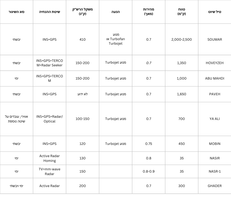 לוח 1 – השוואת פרמטרים של טילי שיוט איראניים