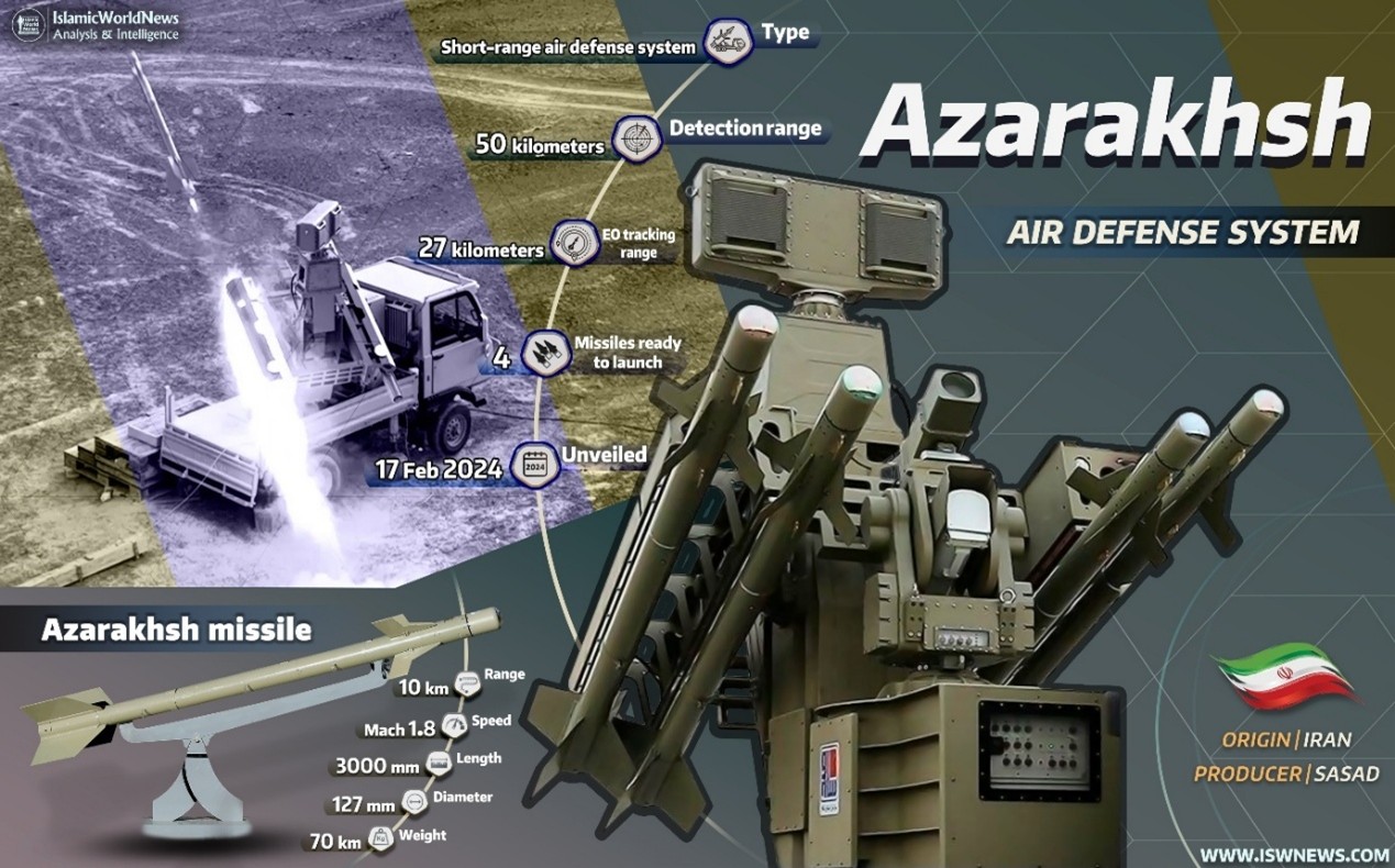 AZARAKHSH היא מערכת הגנה אווירית איראנית לטווחים קצרים. המערכת ניידת לחלוטין ומורכבת כולה על רכב אחד. מערכת AZARAKHSH כוללת מכ"ם חיפוש עם אנטנה בטכנולוגיית Phased Array, מגובה באמצעות מערכת גילוי אלקטרו-אופטית וארבעה טילי AZARAKHSH עם ביות אינפרה אדום פסיבי המכונים גם "סיידוויינדר איראני", משום שהם דומים מאוד למקור האמריקאי. מבחינה מבצעית המערכת דומה מאוד גם למערכות ההגנה האווירית MIM-72 Chaparral האמריקאית ו-SA-13 STRELLA 10 הרוסית, כמובן בתוספת של מערכת הגילוי המכ"מית העצמית של המערכת האיראנית.