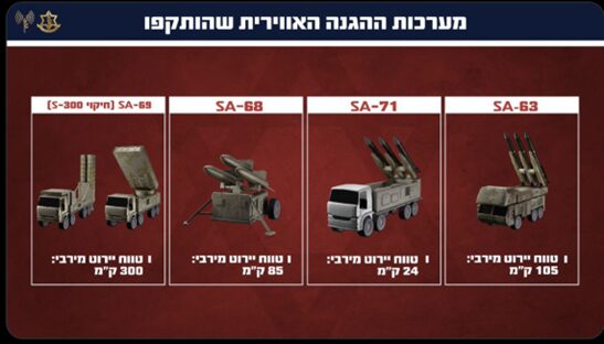 דובר צה"ל הודיע ב-13 ביוני 2025 על תקיפת ארבעה סוגים של מערכות הגנ"א איראניות. שמות המערכות כפי שמופיעים בהודעת הדובר אינם מוכרים ברשימת המונחים של נאט"ו, וגם התמונות שפורסמו נראות של דגמים (אולי הדמיות מחשב) ולא של מערכות אמיתיות. ייתכן שאלו שמות שהעניק חיל האוויר הישראלי למערכות ההגנ"א האיראניות. מניתוח התמונות שפורסמו נראה שמדובר במערכות הבאות (ראו תמונה 29):