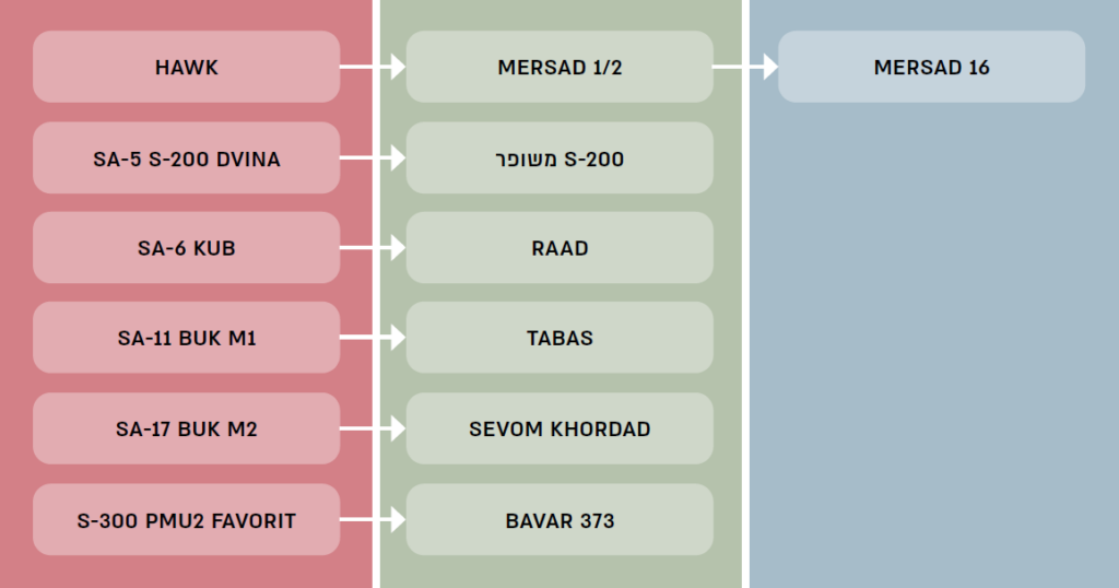 לוח 1 להלן משווה את הפרמטרים העיקריים של מערכות ההגנ"א איראניות שהועתקו או פותחו במלואן באיראן. האיראנים פיתחו עבור מערכות ההגנ"א שלהם מגוון של טילים. גם כאן – חלקם העתקים של טילים שנרכשו ממדינות אחרות (ארה"ב, רוסיה או סין). האיראנים השתמשו בחלק מדגמי הטילים האלה עבור יותר ממערכת הגנ"א אחת: לדוגמה, טיל SAYYAD-3 משמש ארבעה סוגים שונים של מערכות הגנ"א. תהליך דומה חל גם לגבי מכ"מי החיפוש של מערכות אלה.