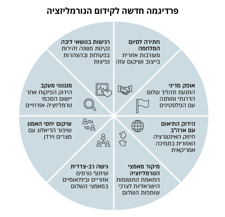 לסיכום, ההמלצות לעיל מתכנסות לפרדיגמה חדשה המניחה יסודות לנורמליזציה לגיטימית-מלאה, קרי לקשר אזרחי, רב-תחומי ועמוק בין ישראל לעמי האזור. לנורמליזציה כזו פוטנציאל לשמש גל נושא אסטרטגי שיחזק את מעמדה הבינלאומי של מדינת ישראל ויקדם בניית קואליציה אזורית נחושה למען השלום והיציבות. בתקווה, קואליציה זו תצמח דווקא מתוך אסון ה-7 באוקטובר והמלחמה הקשה והארוכה שפרצה בעקבותיו, ותהווה בסיס לתהליכי השיקום והאינטגרציה האזוריים, שיסמנו את הניצחון האמיתי על חמאס.