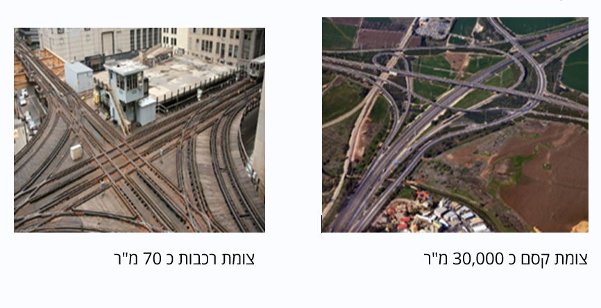 לשם השוואה, תקציב משרד התחבורה לשנת 2020 היה 28 מיליארד שקל - פחות מחצי מתקציב משרד הביטחון. הגדלת תקציב התחבורה עשוי לצמצם במידה ניכרת את הנזק מהגודש בכבישים. תחבורה חוסכת אנרגיה למדינה: רכבת חשמלית בנסיעה בינעירונית מסוגלת להכיל 1,500 נוסעים, במושגי מדינת ישראל מדובר בכמעט אלף חמש מאות מכוניות פחות על הכביש. במושגי חיסכון תחבורה, מסילתית חשמלית צורכת כעשירית מהאנרגיה הנדרשת מתחבורת כלי רכב באותה קיבולת נוסעים. זאת ועוד, תחבורת רכבות חוסכת קרקעות: רוחב המסילות בקווים בינעירוניים הוא כ-9 מטרים, רוחב כביש דו מסלולי נע בין 30 ל-40 מטרים. מחלף קסם, לדוגמא, פרוס על כ-30,000 מ"ר מרובע, ומחלף רכבת כולל 70 מ"ר.