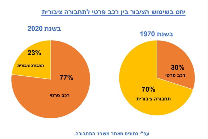 נתונים אלה הם תוצאה ישירה של עיצוב מדיניות ציבורית, שיצרה משוואה בעייתית של שימוש יתר ברכב פרטי בכבישי הארץ בכלל ובאזורים העירוניים בפרט. כאשר בוחנים את הנתון הזה בהשוואה לארגון הבריאות העולמי, ניתן להסיק שרוב הנפגעים מזיהום האוויר הם כתוצאה מתנועת כלי רכב בכבישים. נתון זה משתקף גם בדיאגרמה, הנותנת ביטוי למאזן בין תחבורה ציבורית, שמצמצת שימוש ברכב פרטי, לבין המצב בפועל.