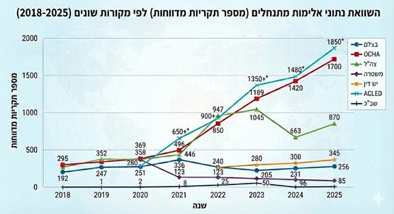 הערה בדבר מגבלות הנתונים: קיים קושי אובייקטיבי ליצור תמונת מצב אחידה, הנובע מפערים מהותיים בין הגורמים השונים לגבי הגדרת "אלימות של קיצונים" ו"טרור יהודי". גופים פלסטיניים ובינלאומיים נוטים לדיווח-יתר (Over-reporting) וכוללים בהגדרת "אלימות" ספקטרום רחב של אירועים. הנתונים הרשמיים בישראל סובלים מדיווח-חסר, הנובע הן ממיעוט התלונות המוגשות למשטרה מצד הנפגעים הפלסטיניים והן מהגדרות סיווג מחמירות (הפרדה בין "טרור" ל"פשיעה לאומנית" ל"אלימות"). עם זאת, גם נתוני הצבא הרשמיים מציירים תמונה מדאיגה. גורמי ביטחון בישראל מסכימים שהתופעה ממשית ומחריפה ואכן נוכח מגמת ההסלמה, הוקם במאי האחרון צוות בין-ארגוני משולב (צה"ל, משטרה ושב"כ) לסיכול וחקירת מעורבים באלימות זו.