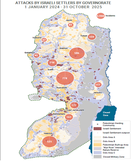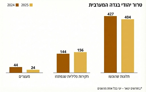 נתונים ממקורות שונים מעידים על הסלמה חדה בהיקף הטרור היהודי נגד פלסטינים ביהודה ושומרון. דו"ח עדכני של פיקוד המרכז מצביע על עלייה של כ-27 אחוזים בהיקף הפשיעה הלאומנית בשנת 2025 (כ-870 אירועים), לצד החמרה באופי האלימות – 120 אירועים סווגו כחמורים לעומת 83 בשנת 2024. נתוני האו"ם מציגים תמונה שלילית יותר, בשנת 2024 תועדו כ-1,420 אירועי תקיפה נגד פלסטינים – עלייה של 16% לעומת 2023, והרמה הגבוהה ביותר מאז החל התיעוד בשנת 2006. אירועים אלו גרמו למותם של חמישה פלסטינים ולפציעת כ-350, וכן לעקירת מעל 300 משפחות פלסטיניות (כ-1,700 נפשות) מבתיהן. המגמה נמשכה ב-2025: השיא שנרשם בשנת 2024 נחצה אף הוא עם למעלה מ-1,770 תקיפות. הנתונים מלמדים שאלימות של קיצונים יהודים אינה רק "תג מחיר" בתגובה לפיגועים: למשל, ברבעון הראשון של 2025 זינקו התקפות נגד פלסטינים בכ-30% לעומת התקופה המקבילה בשנה הקודמת, אף שבאותה התקופה ירד מספר פיגועי הטרור הפלסטיניים בכ-44%.