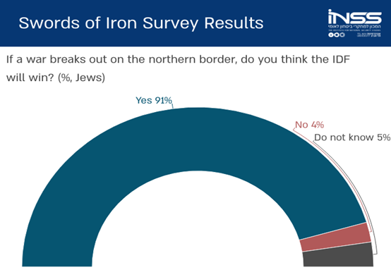 Moreover, the rallying around the flag that characterized the early days of the Swords of Iron war also reinforced the public’s confidence that, if war were to break out on the northern border, the IDF would win it. This was the case despite broad recognition that Hezbollah’s Radwan Force is a trained and skilled force, and that fighting on this front could be difficult. In a survey conducted by INSS a few days after Hamas’s attack, on October 15, 2023, more than 90% of respondents among the Jewish public answered positively when asked whether they thought that the IDF would win if fighting broke out on the northern border (see Figure 1).