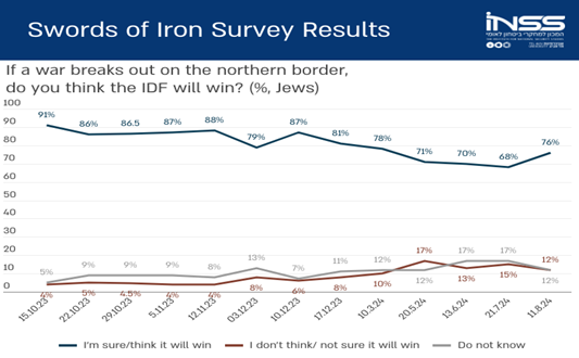 The targeted killing signaled to the public a shift in perceptions of the fighting in the north, including a greater willingness to escalate. This shift was reflected in an INSS survey conducted in August 2024 following the operation. The share of Jewish respondents who believed that if war were to break out in the north, the IDF would win it rose significantly: 76% answered affirmatively, compared to 68% a month earlier, in July 2024 (see Figure 8).