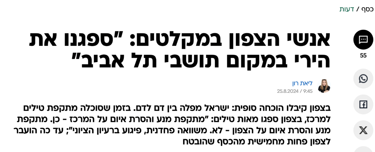 The fact that already before the war, the northern region was perceived by many in the Israeli public as a social periphery, provided fertile ground for a sense that Tel Aviv was treated one way and Kiryat Shmona another. This feeling deepened particularly when attacks on Tel Aviv were met with responses seen as forceful, while attacks on northern communities drew what were viewed as more moderate reactions. This sentiment peaked in July 2024, after a UAV strike on Tel Aviv triggered an extensive Israeli response, whereas northern communities had already absorbed dozens of UAV and missile attacks under what was widely perceived as a policy of restraint. Numerous newspaper headlines and social media posts criticized this differential approach (see Figure 4).