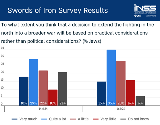 In the days following the strike and Hezbollah’s response, rocket fire toward northern communities continued, and public discourse calling for a more forceful response intensified. A survey conducted in September 2024 showed a nuanced shift: The share of respondents who believed that extending the campaign into a full-scale war would be based on substantive rather than political considerations remained stable, but the proportion who thought political considerations would play only a small or very small role rose significantly (see Figure 10). This may reflect a perception that the escalation resulted from an Israeli initiative and did not necessarily represent an unavoidable response to developments in the confrontation.