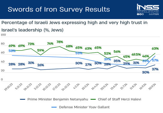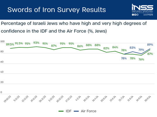 These feelings—especially the protracted nature of the fighting and the fact that, despite intensified attacks on the north, Israel’s response there remained conservative and reactive—gradually fueled criticism and declining trust indicators. For example, at the start of the war, about 90% of the Jewish respondents believed that if war broke out on the northern border, the IDF would win it. By July 2024, that confidence had eroded to only 68%.
