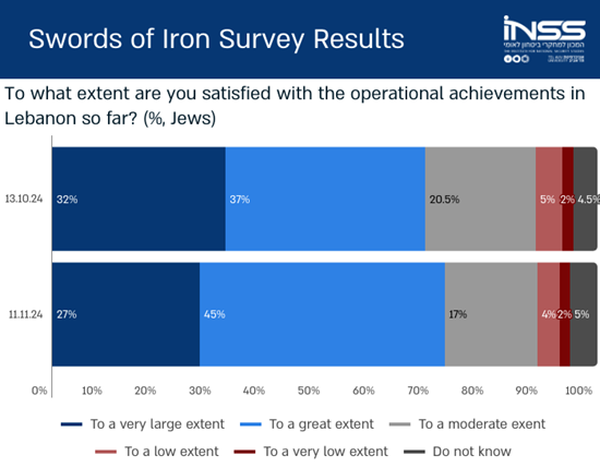On October 1, 2024, the IDF launched a ground operation in southern Lebanon, alongside continued airstrikes and targeted killings of senior Hezbollah officials. In a survey conducted shortly after the start of the ground offensive, the Jewish public reported high satisfaction with the operation’s achievements. This satisfaction increased as the campaign progressed, as reflected in survey data collected in November 2024 (see Figure 13). The perceived success of the operation also strengthened public trust in the IDF and suggested a partial recovery in assessments of the military’s professional capabilities, which had been severely shaken by the events of October 7. The campaign’s impressive achievements, as well as the relatively low number of casualties—despite earlier warnings and public preparation for a far more difficult operation—also contributed to perceptions of success.
