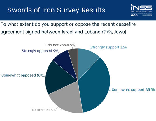 On November 27, 2024, Israel and Lebanon signed a ceasefire agreement. The public had been split over the desired end state; however, once the agreement was signed, support outweighed opposition in an INSS survey conducted in December 2024, even though the full details of the agreement were not published in Hebrew for the wider public (see Figures 15 and 16). It should be noted that a relatively large part of respondents, about one-fifth indicated neither support nor opposition. Despite the relatively wide support, only a small minority believed that the agreement would ensure many years of security quiet. This likely reflected a general skepticism following the events of October 7 about the possibility of sustained calm in any arena.