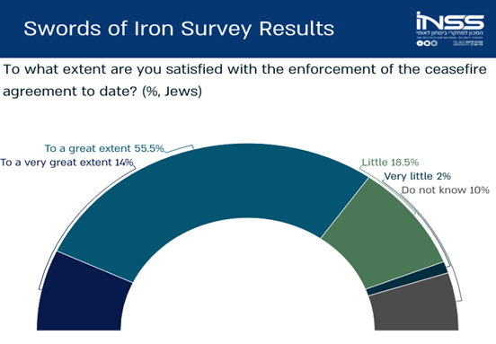 Accordingly, after the agreement was signed, the fact that the IDF not only responded to every violation but was also perceived as proactively striking to prevent Hezbollah’s force buildup or reconstruction contributed to high levels of public satisfaction with the agreement’s enforcement in the north. For example, in a survey conducted in May 2025, a large majority of Jewish respondents (about 70%) said that they were satisfied to a great extent or to a very great extent with how the ceasefire agreement was being enforced in the north at that time (see Figure 17). This policy was accompanied by frequent meetings between senior IDF officers and local authority heads and residents, during which operational achievements and enforcement measures were reviewed. Another factor that strengthened citizens’ sense of security—and contributed to the residents’ willingness to return to their communities—was Hezbollah’s lack of response to the IDF’s frequent strikes.
