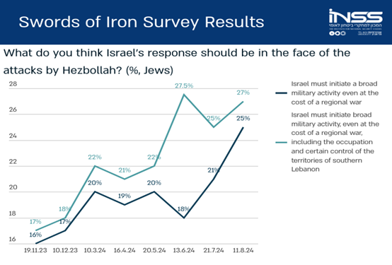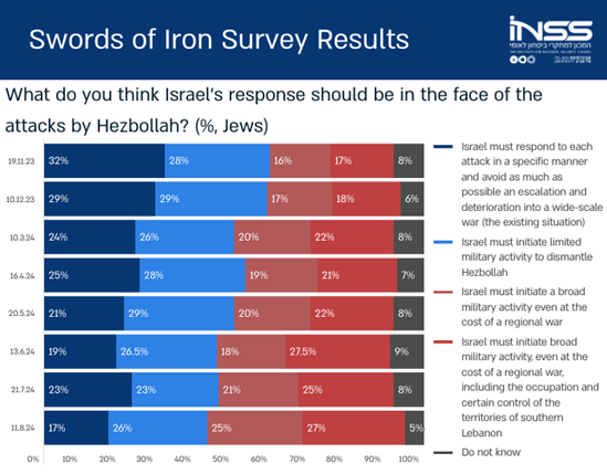 However, even though Hezbollah also adopted an approach referred to as a “policy of equations,” fighting along Israel’s northern border continued throughout, and the “defensive battle” phase against Hezbollah became entrenched. The public perceived this phase through two main lenses. On the one hand, there was the prolonged evacuation of northern residents from their homes and the extensive destruction in the communities caused by Hezbollah’s attacks, alongside the directive to keep the campaign below the threshold of war. Together, these factors fostered a sense that the northern front had been abandoned—and above all, that the residents had been abandoned. Against this backdrop, it should not be surprising that as time passed, an increasing share of respondents in surveys conducted by INSS supported adopting a more forceful response policy toward Hezbollah—even at the price of a regional war (see Figures 2 and 3).