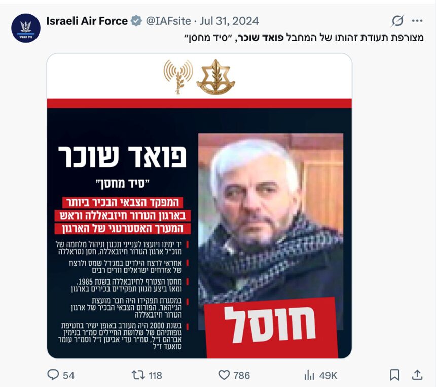 Figure 7. Israeli Air Force Announcement About Elimination of Fuad Shukr